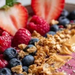 - Arrange the halved strawberries, blueberries, raspberries, and dollops or streaks of peanut butter on top. Sprinkle the granola last to keep it crunchy.