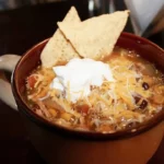 A comforting soup made with shredded chicken, enchilada sauce, tomatoes, corn, and crunchy tortilla strips, perfect for chilly days.