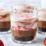 Imagine opening the refrigerator to the cool, sweet scent of ripe strawberries and the faint, irresistible aroma of melted chocolate. The first spoonful gives you a silky, creamy cheesecake that melts on your tongue, punctuated by bright, slightly tart ribbons of strawberry and a whisper of chocolate richness. Texturally, these little cups balance plush creaminess with the delicate lift of whipped cream, while the swirl of strawberry puree adds a fresh, berry-forward pop. They feel like a celebration in miniature — comforting, playful, and a perfect bite-size indulgence.