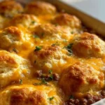 A comforting one-pan casserole with ground beef, creamy filling, and golden biscuits topped with melted cheddar cheese.