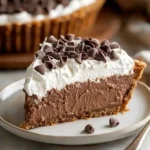 An indulgent no-bake chocolate pie featuring a buttery graham cracker crust, creamy filling, and topped with whipped cream.