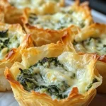 Aroma first — warm, golden phyllo releasing a buttery scent that promises crispness; then the creamy, garlicky filling that teases the palate with tangy Parmesan and the vegetal sweetness of wilted spinach and artichoke. With each bite you get a satisfying contrast: delicate, flaky shells giving way to a rich, slightly gooey center dotted with tender artichoke pieces. These bite-sized cups make the comfort of classic spinach-artichoke dip portable and elegant.